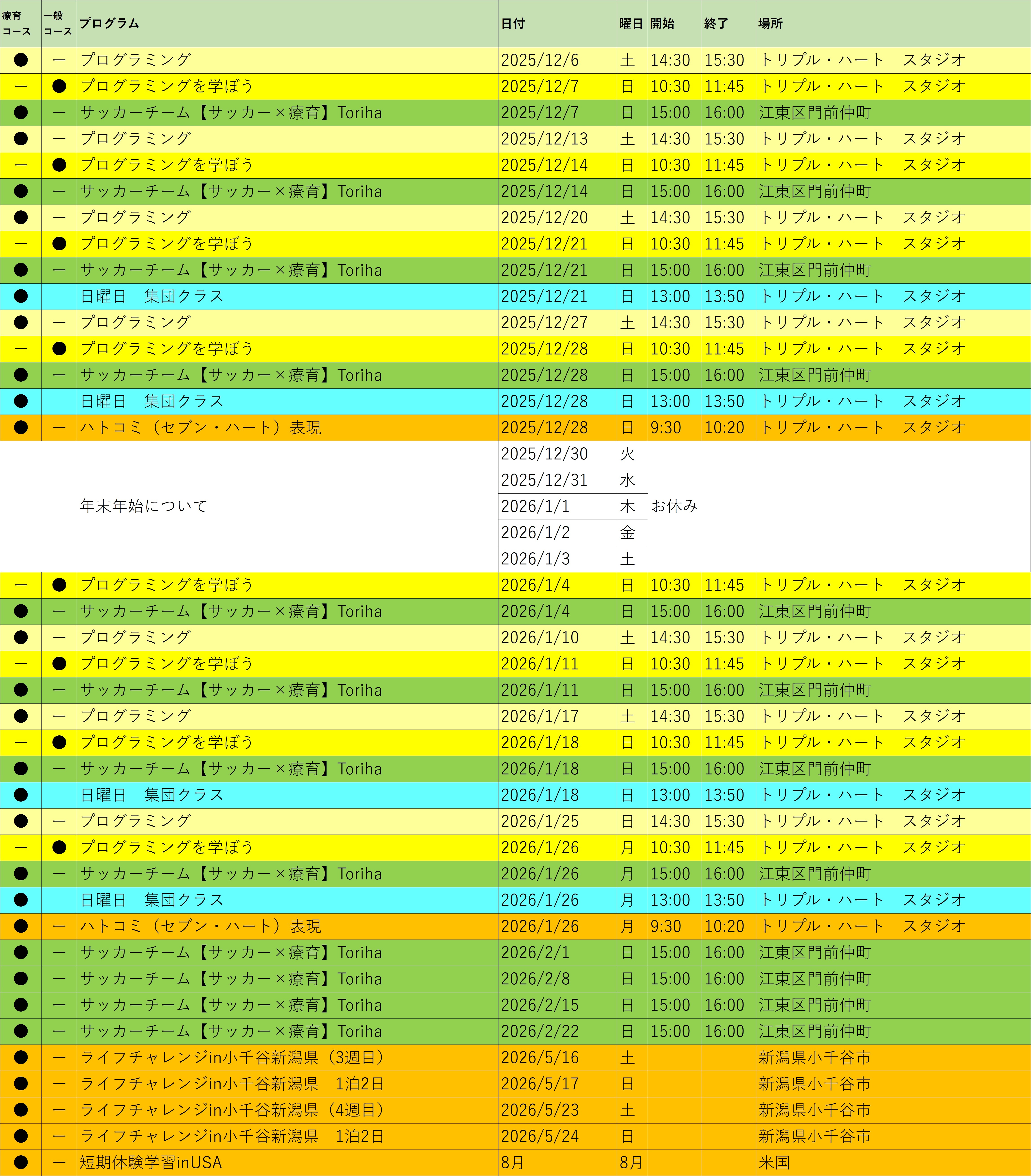12月30日(火)、31日(水)、2026年1月1日(木)、2日(金)、3日(土)は休校となります。